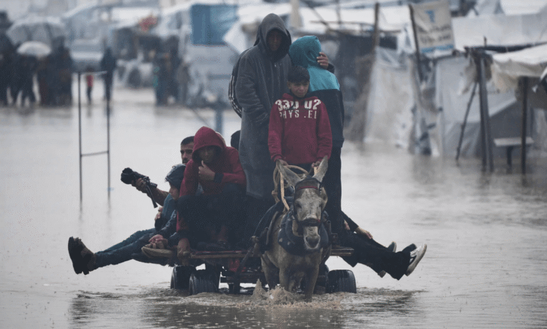 طفل فلسطيني يشق طريقه بين خيام غارقة في المياه، حاملاً أغراضه على ظهره وسط الدمار والفيضانات، في مشهد يعكس حجم المعاناة اليومية للنازحين في قطاع غزة، حيث تحوّلت الخيام المتهالكة إلى مأوى هشّ في مواجهة الشتاء القارس ونقص المساعدات الإنسانية – الصورة لـ رويتـرز